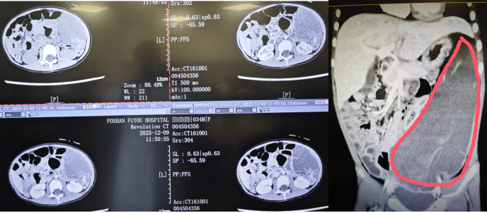 近日,我院小儿外科团队应用腹腔镜微创技术,成功为一名2岁女童完整切除了腹腔内的巨大囊肿。患儿因“腹痛2天”入院,经外院及我院检查,CT检查提示腹腔内存在一个巨大囊性占位,囊肿大小约111×47×163mm大小,范围上至肝脾间隙,下达盆腔,对周围脏器形成明显压迫,极易因破裂出血或者感染而引起严重的腹腔感染,需尽快手术治疗。